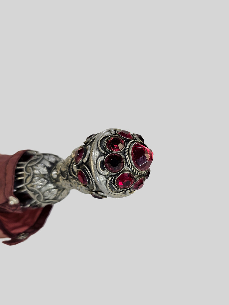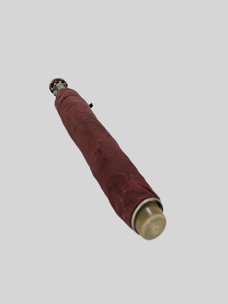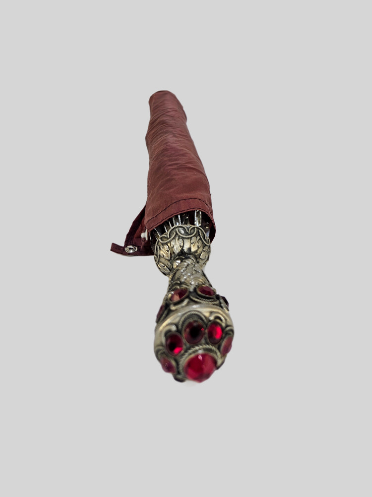 Super mooie vouw paraplu met gothic handvat ingelegd met op robijn lijkende stenen.
