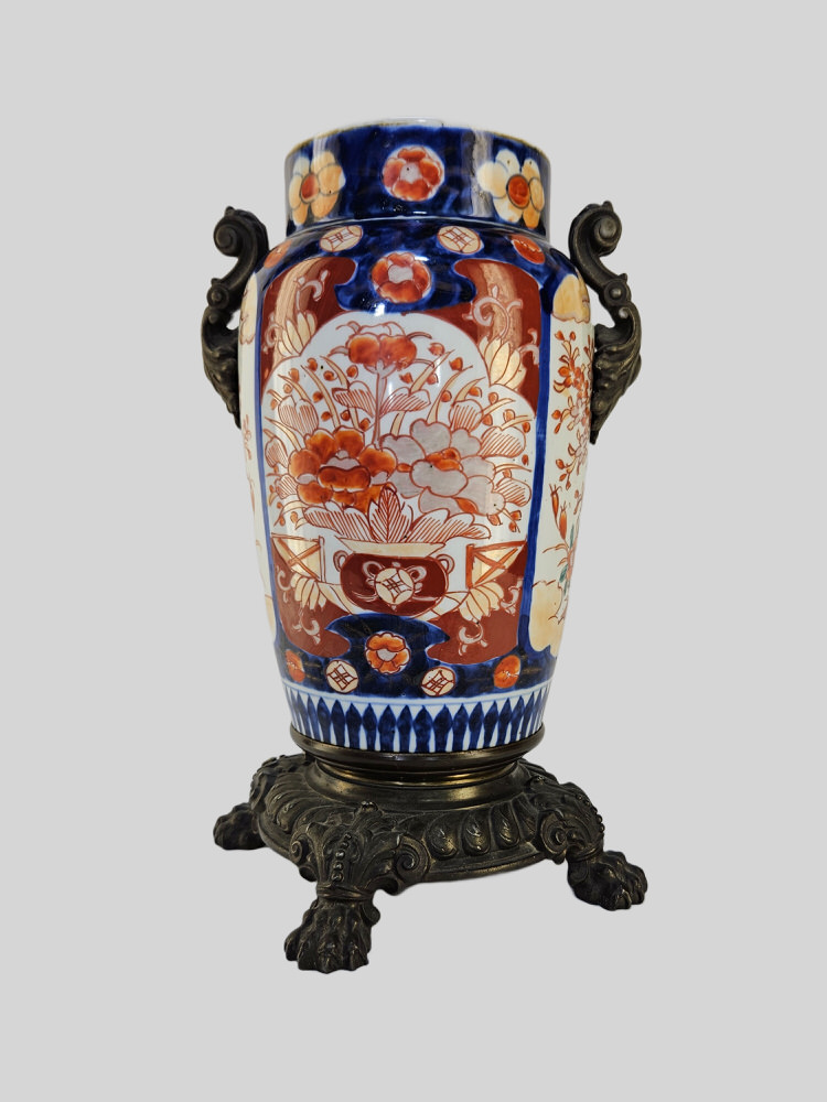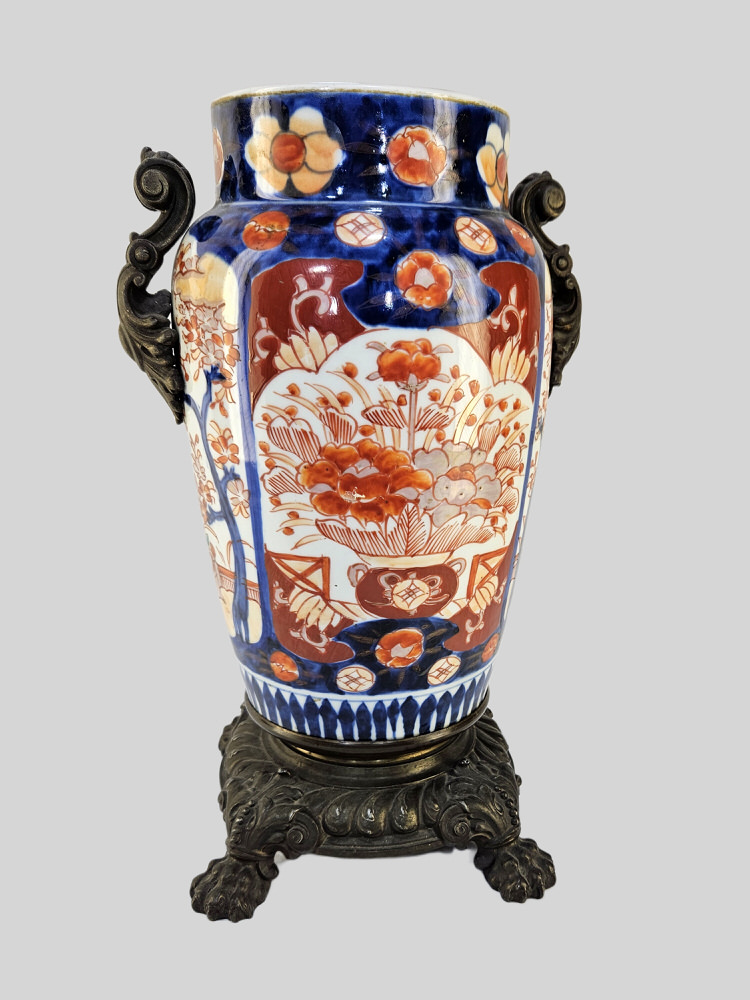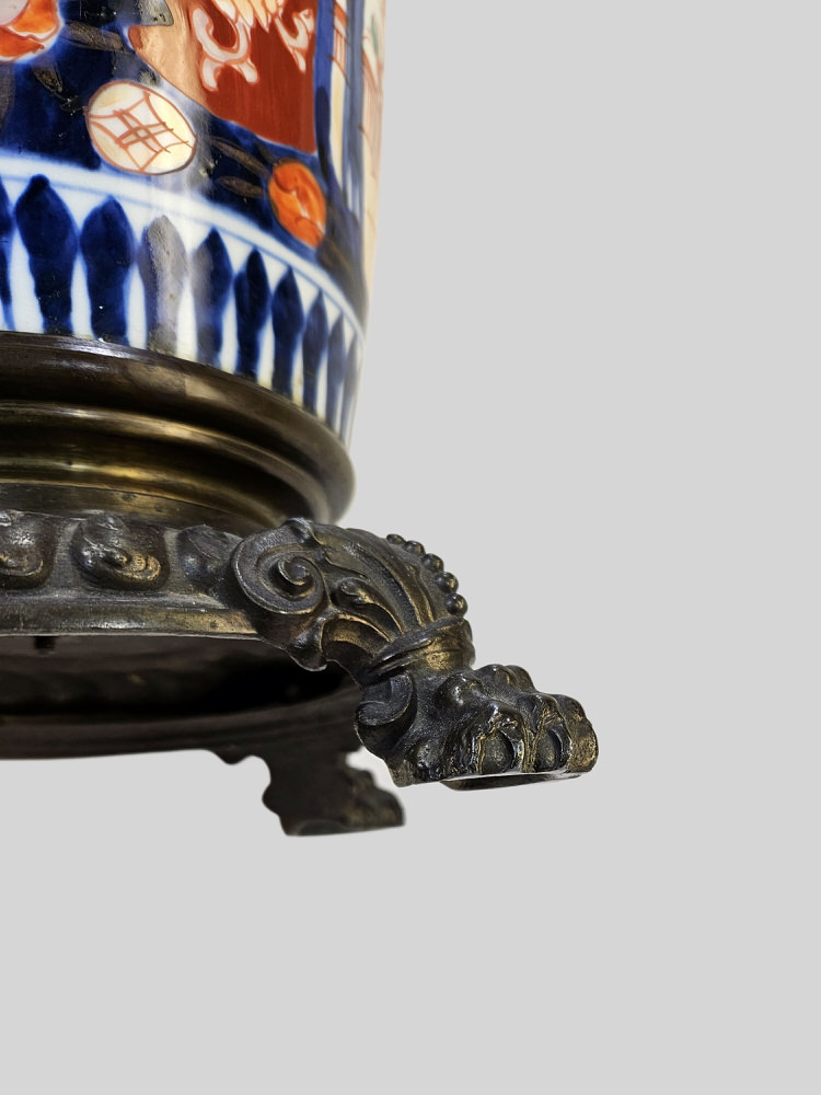 19e Eeuwse Japanse Imari porseleinen siervaas met messing armaturen.