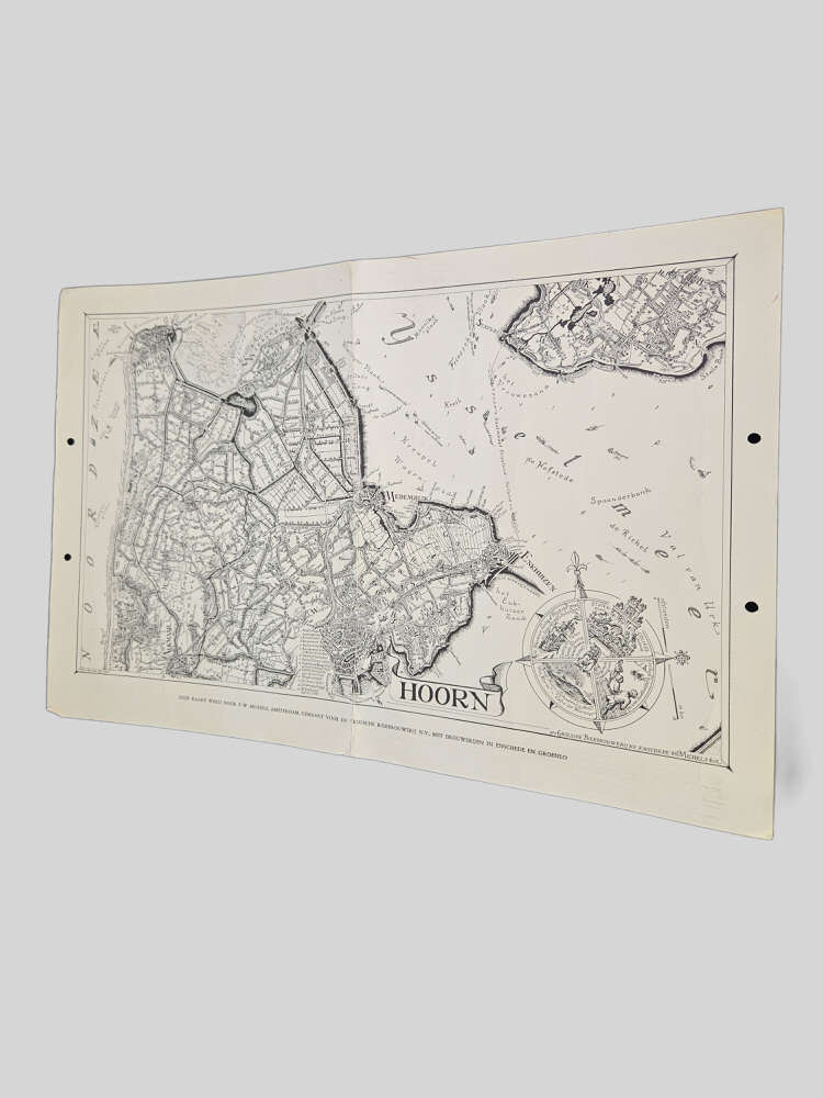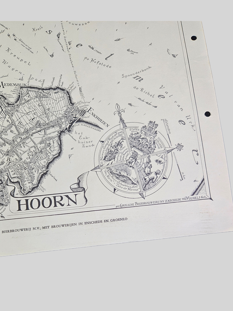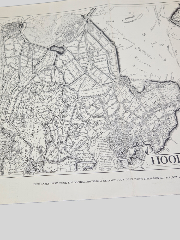 Unieke landkaart vermoedelijk uit de jaren 60. Deze kaart werd door F.W Michels uit Amsterdam, gemaakt voor de Grolsche brouwerij NV, met brouwerijen in Enschede en Groenlo. Op de kaart is het gebied rond Hoorn afgebeeld