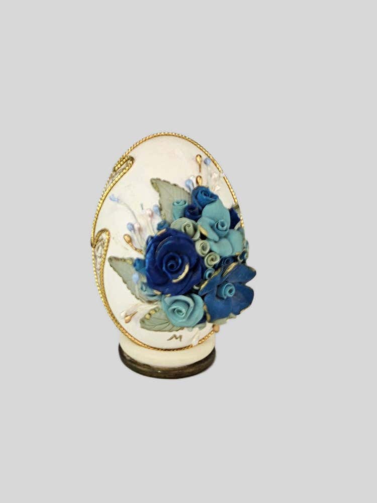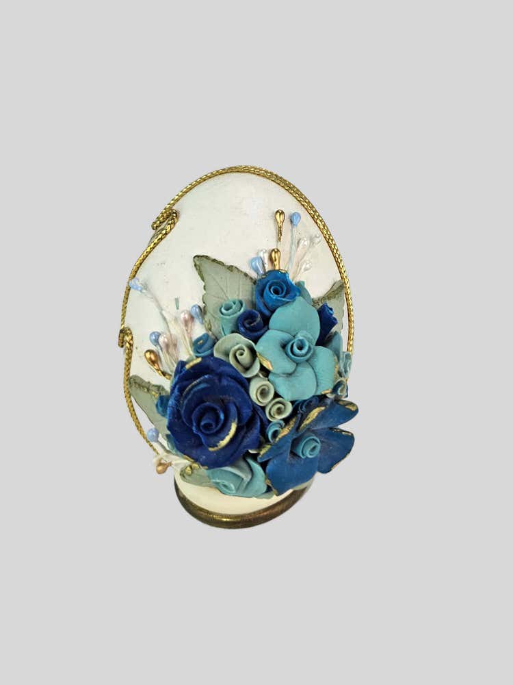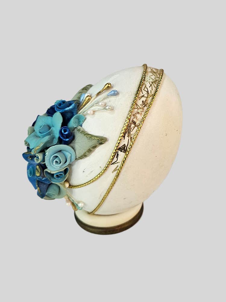 Het 3D versierde ganzenei is met zorg en vakmanschap gemaakt, wat te zien is aan de fijne details en de handtekening van de maker. De combinatie van het blauwe rozen motief en de goudversiering geeft het een ei een luxueuze uitstraling. Ondanks dat het ei in redelijke staat verkeert en gebruikssporen vertoont, voegt dit juist karakter toe aan het stuk en laat het zien dat het een geschiedenis heeft.