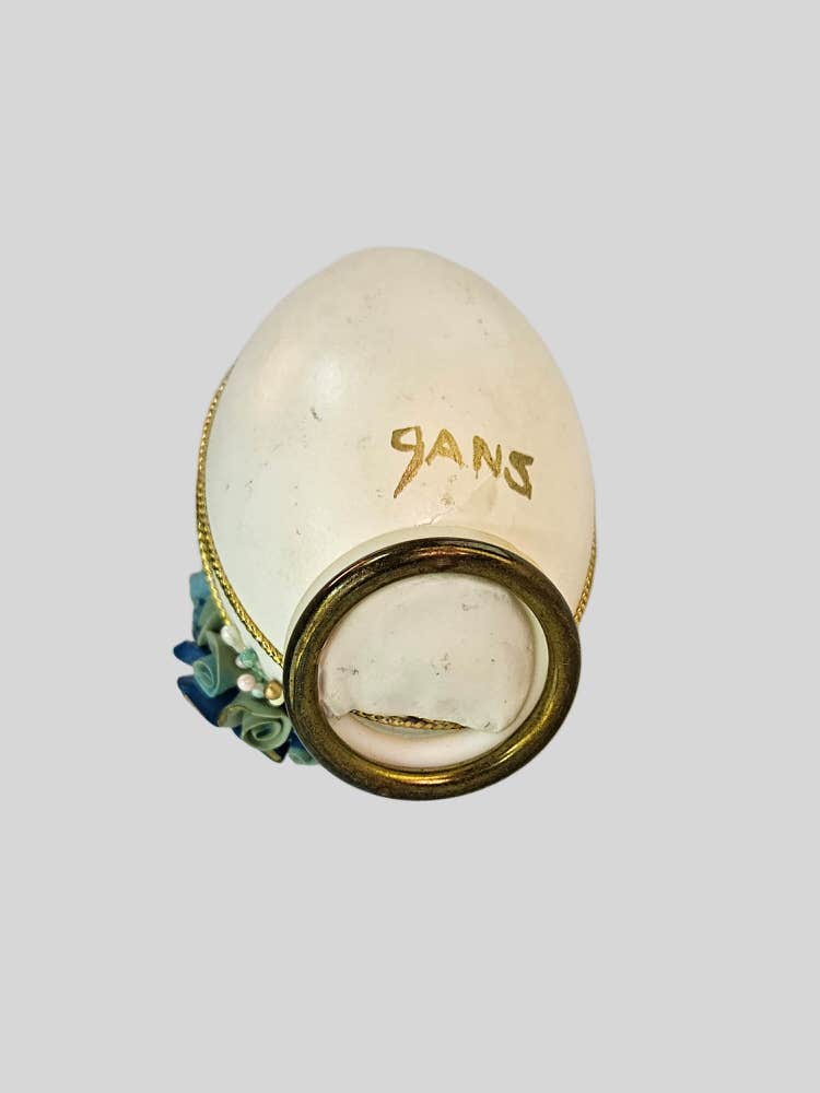 Deze prachtige vintage versierde ganzen ei is werkelijk uniek en adembenemend. Met een opgelegd blauw rozen motief en goudversiering, straalt dit ei elegantie en schoonheid uit. Het ganzen ei is slechts 8,5 cm hoog, maar heeft een grote impact door zijn gedetailleerde ontwerp. Het is een waar kunstwerk dat zeker de aandacht zal trekken in elke kamer waar het wordt geplaatst.
