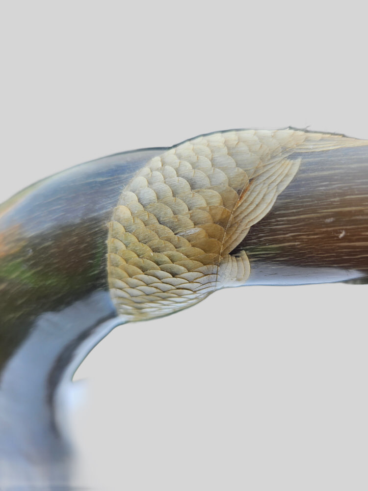 De waterbuffelhoorns zijn zeldzaam wanneer ze worden gesneden met exotische patronen (draak en paradijsvogel) door Thaise ambachtslieden. Het ambachtelijke beitelwerk en de kwaliteit van de afwerking maken het geheel af van deze gebeeldhouwde buffelhoorns uniek en altijd anders. Zeldzaam en uniek stuk.